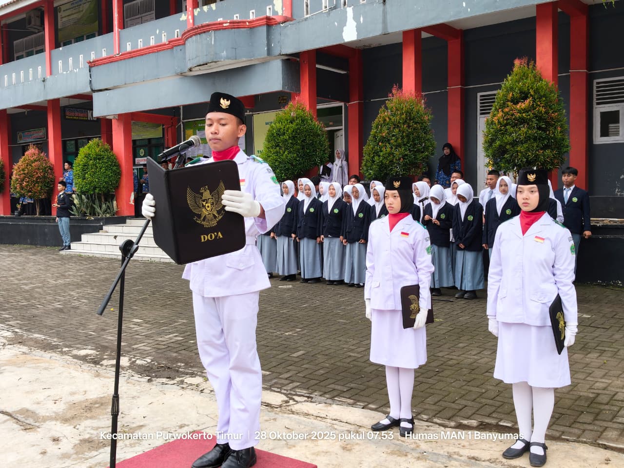 Banyumas, Humas — Lapangan upacara MAN 1 Banyumas pagi ini dipenuhi semangat nasionalisme para peserta didik, guru, dan tenaga kependidikan yang turut memperingati Hari Sumpah Pemuda ke-97. Dengan mengusung tema “Pemuda Pemudi Bergerak, Indonesia Bersatu,” kegiatan berlangsung dengan khidmat dan penuh makna.